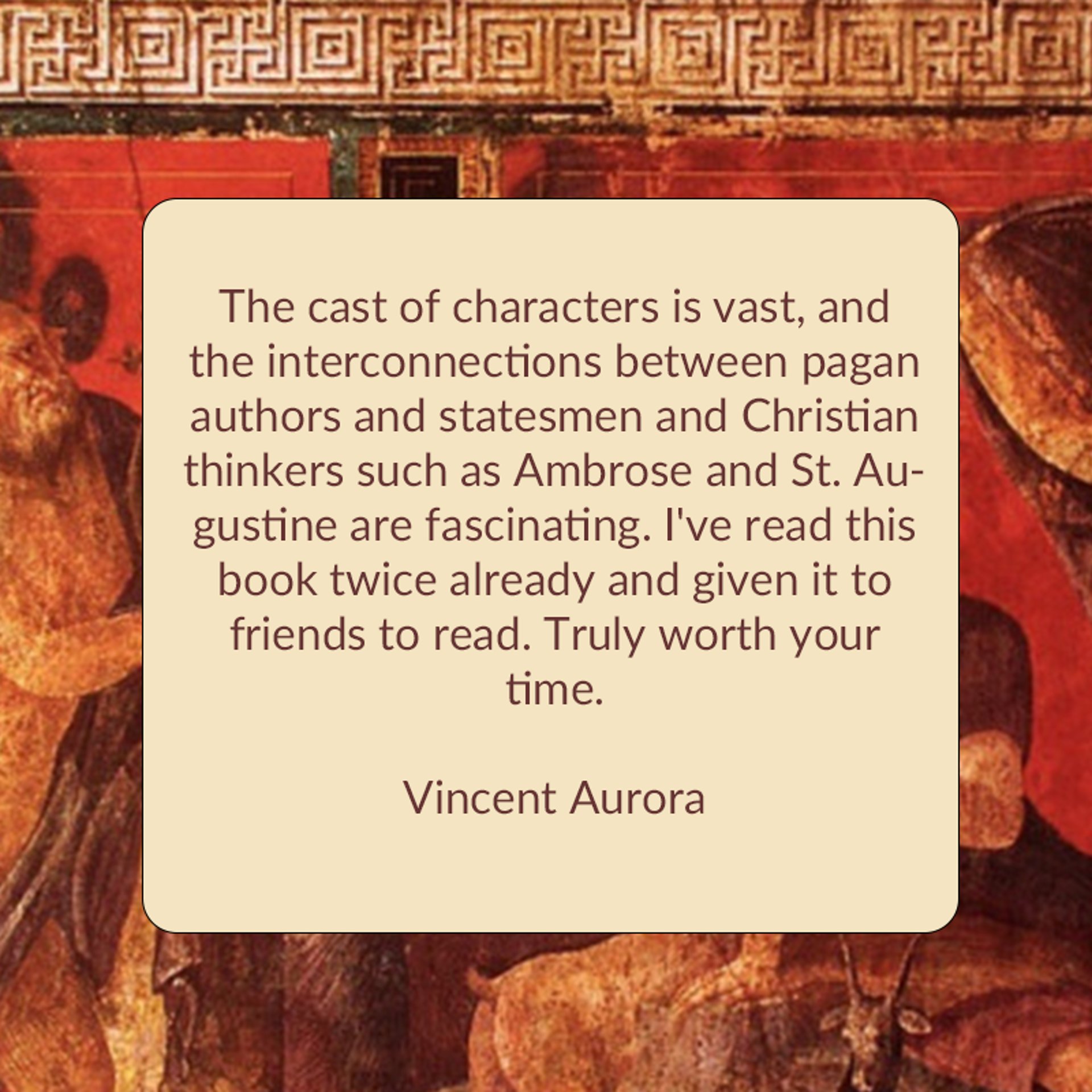 The cast of characters is vast, and the interconnections between pagan authors and statesmen and Christian thinkers such as Ambrose and St. Augustine are fascinating. I've read this book twice already and given it to friends to read. Truly worth your time.