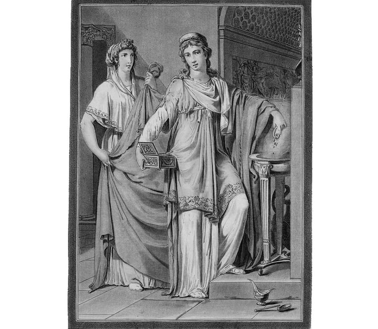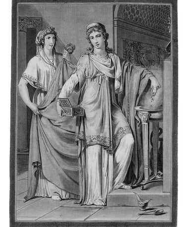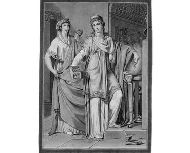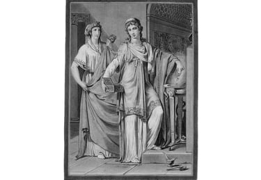 The illustrations to Titus and Berenice are by Philippe Cherry (1759-1833), engraved by Pierre Michel Alix (1762-1817), and taken from the 1802 edition of Recherches sur les Costumes et sur les Théâtres de toutes les nations, tant anciennes que moderns (Research on the Costumes and Theaters of all Nations, Ancient as well as Modern), first published by M. Drouhin, Paris 1790. All refer to Bérénice, the 1670 play by Jean-Baptiste Racine.